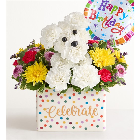 Now, this is a party animal! Our doggone adorable floral pup is hand-designed in a keepsake ceramic vase decorated with polka dots and “Celebrate” in gold script. Get ready to unleash the fun and create many long-lasting memories.